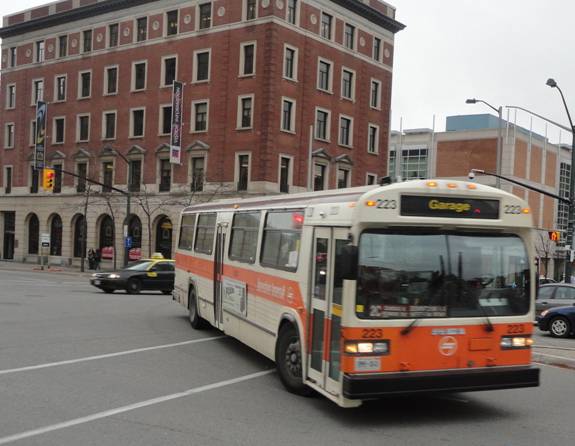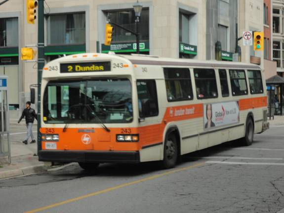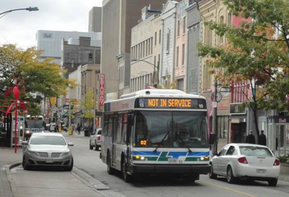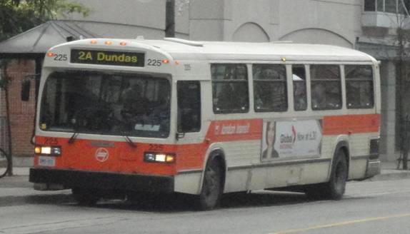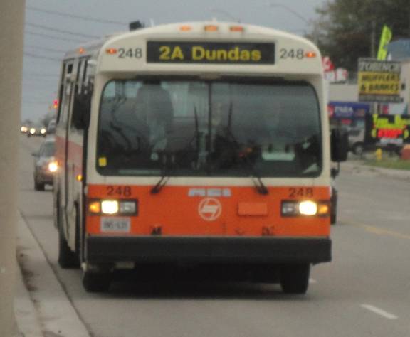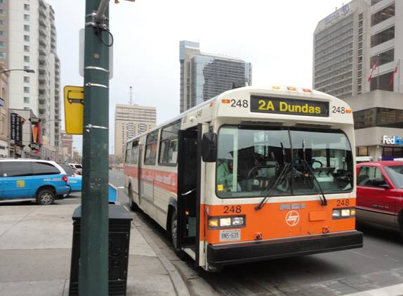 I then walked a couple blocks to Dundas Street to catch a route 2 bus east to my hotel which was a Knights Inn. While waiting for my bus, I photographed Classic 243 going westbound on route 2 as well as a deadheading Ez-Rider.