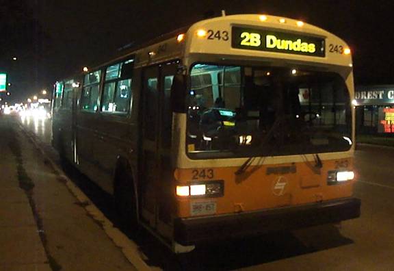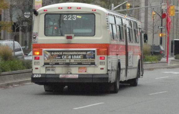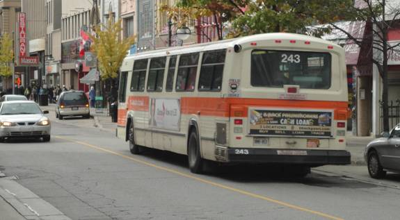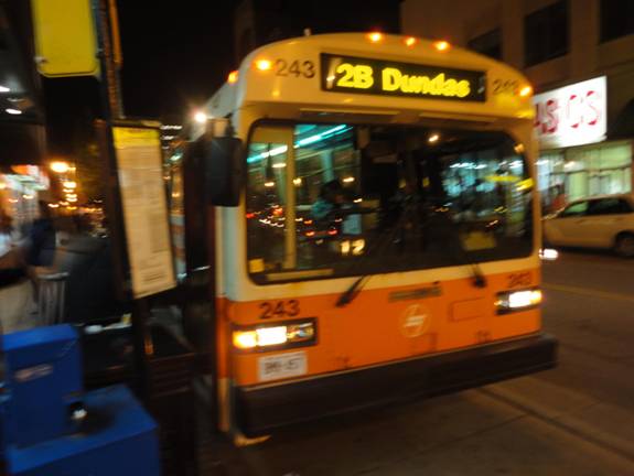 I got off the bus at the intersection of Dundas and Richmond. I stood outside a McDonald's and remembered how 10 years earlier I was standing outside the same McDonald's when a man motioned for me to come in and said something about {prince} Charles being in the stocks. Most likely, that guy was crazy. I waited for a route 2 bus back to my motel. When my bus arrived, it was Classic #243. I photographed it before I got on.