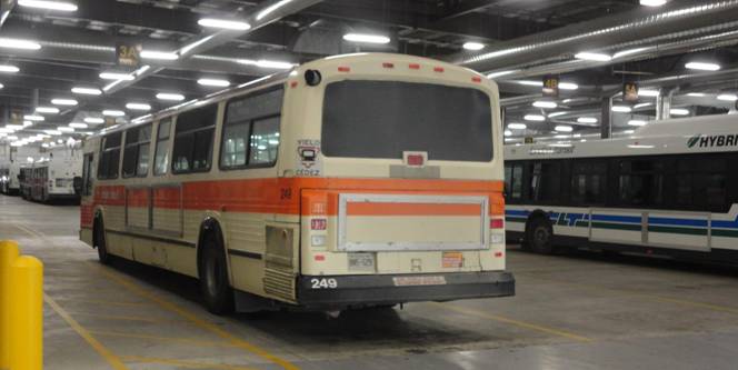 I then got back on Classic 242. Our next photo stop was at London Transit's new garage. The garage opened on May 2nd of this year. It is normally used on weekdays, but we were able to have a supervisor give us a tour. We pulled in and I saw Classic #249 and lots of low floor buses. The supervisor said the garage can handle 100 buses, but right now it only has 44 but that could change in the next few years. We photographed various buses in the garage including some hybrid buses, Some EZ-riders, and two D60LFs.