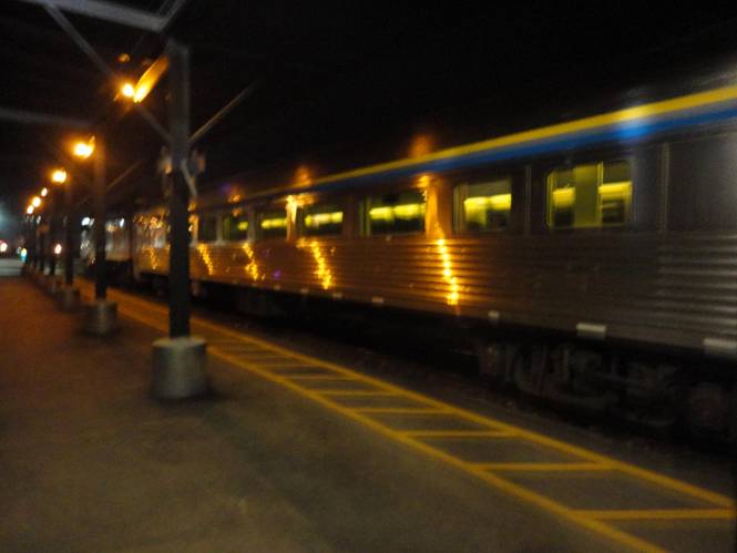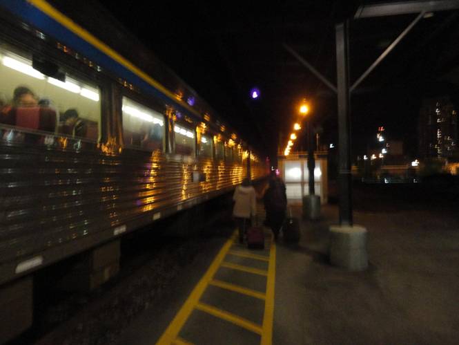 Train 79 passed. A little while later, we stopped at Brantford. We sat in Brantford for several minutes. We left and soon we picked up speed. There wasn't much to see from the window since it was night time.