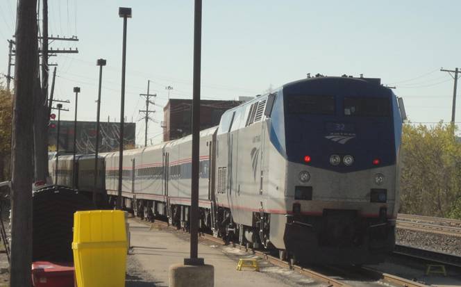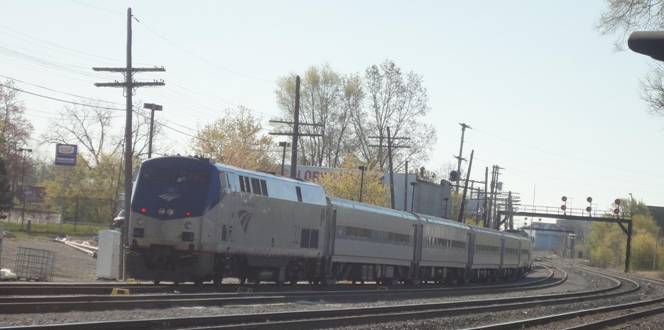 I went downstairs and checked out. The taxi came a few minutes late, but I had plenty of time. I got to the Amtrak station a few minutes later. I paid the driver and went out. I saw the train that would become today's 353 parked south of the station. This is because of a grade crossing at the south side that is blocked when the train's in the station. I walked over and photographed the train.