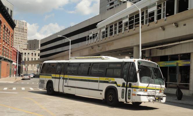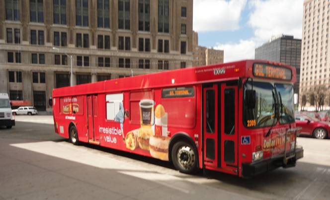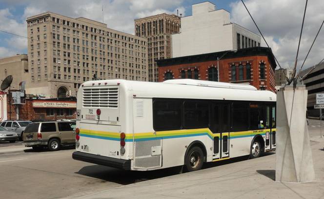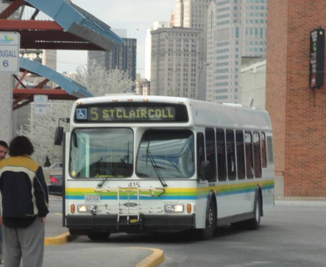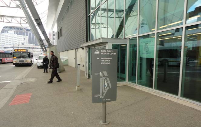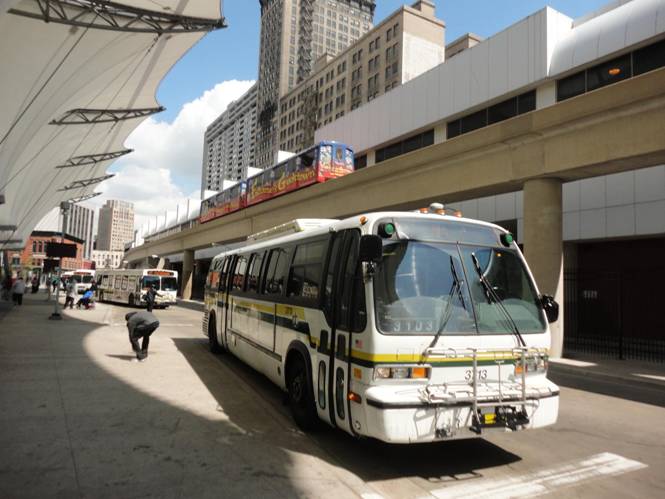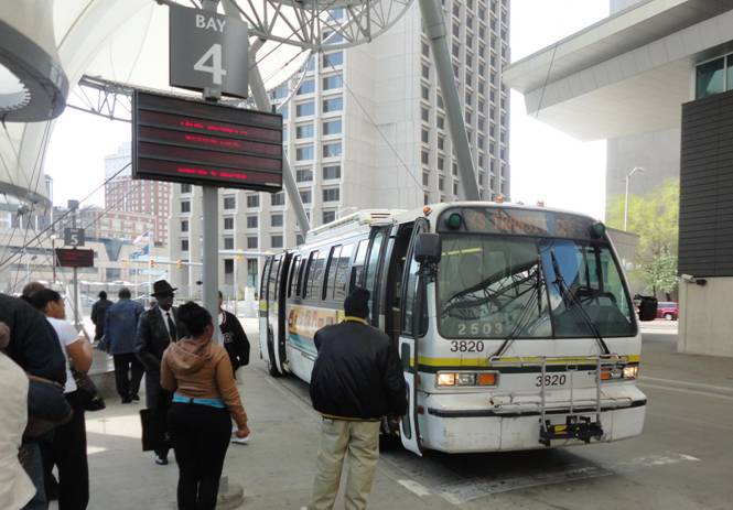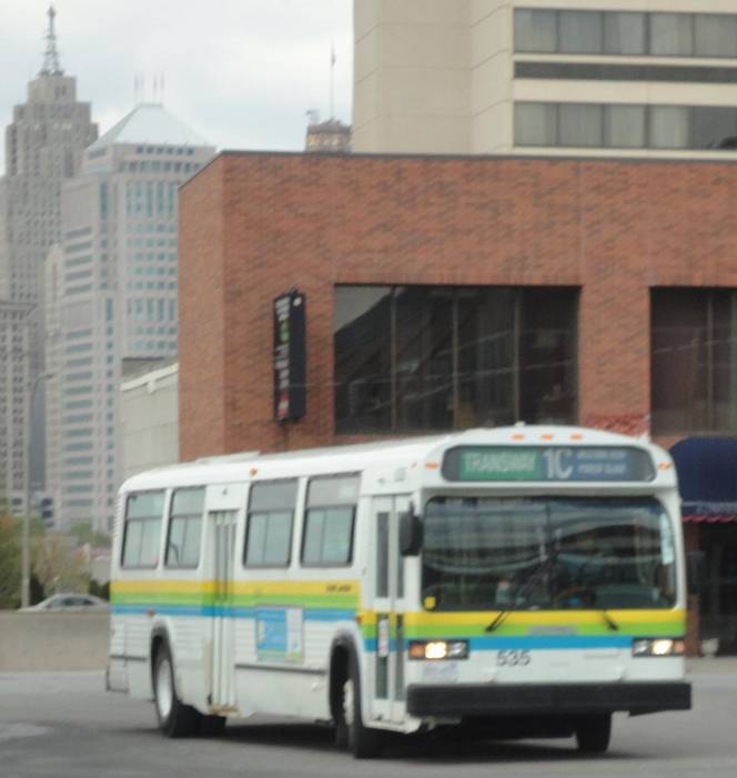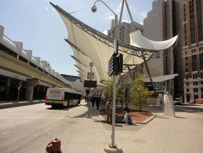 I exited the station and went out to the street. I got off at Times Square because it's right beside DDOT's downtown transit terminal called the “Rosa Parks Transit Centre”. Ironic a transit terminal is named after someone who's claim to fame was breaking an unfair transit bylaw. However, I'm sure many people are proud to have a transit terminal named after Rosa Parks and I'm proud too. Who knows, maybe in 50 years there will be a transit terminal named after me! {Wishful thinking, but you never know!} Again, if Rosa Park's peers has accused her of giving the black community a bad name instead of rallying behind her, I don't see this terminal named after her. I took a photo of the terminal and then photographed a DDOT RTS as it entered the terminal.