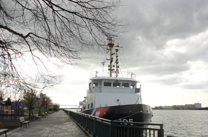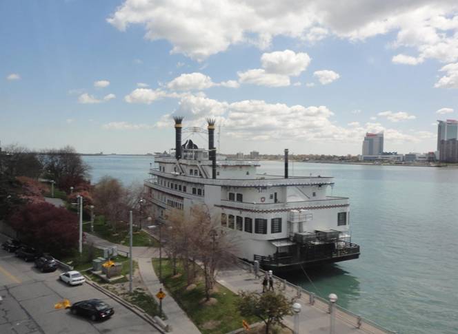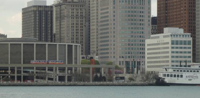 I rode 548 a short distance before I got off and filmed it pulling away. I rode another XDE40 back to the terminal. I decided to walk near the riverfront and I could see the Detroit People Mover. At one point, I photographed the train and a nearby tug boat.