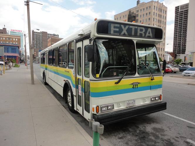 I got to my hotel and checked in at 2:00. I went to my room and relaxed for a bit before I headed out. I noticed there weren't a lot of electrical outlets in the room. After awhile, I headed out and walked over to a bus terminal. I photographed Transit Windsor Orion 5 #411 parked on the street.