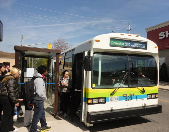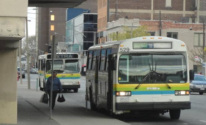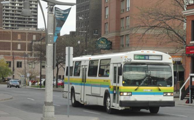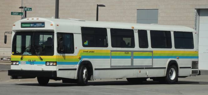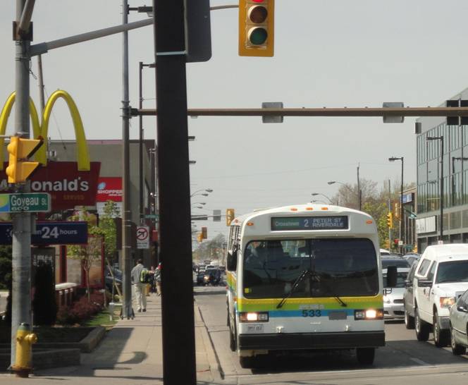 I filmed 523 pulling away. I caught a route 2 bus to Goyeau Street and bought lunch at the McDonald's near my hotel. I then waited for the next route 2 to take me to the VIA station. I had read the route 2 was an accessible route. However the next route 2 was Classic #533! I photographed it before I got on.
