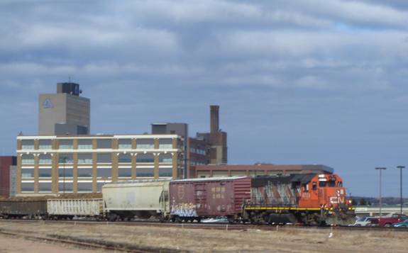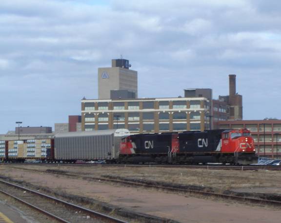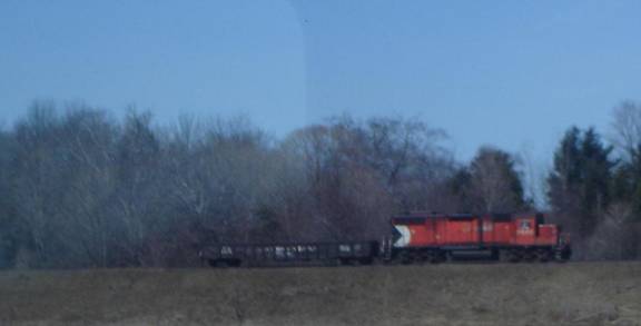 I headed back into the station and bought a bottle of Coke from a vending machine. I headed onto the platform and saw a local freight with a single CN GP38 leading. I photographed and filmed it.