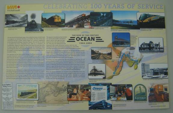 I saw a couple other railfans who I began to chat with. One of them used to work for CN and VIA. After, I went back into the station and checked one bag because VIA only allows one carry on for trains with Renaissance coaches. I called to find out the status of train 15 and found it was running on time. I also photographed a sign commemorating the Ocean’s 100th anniversary back in 2004.