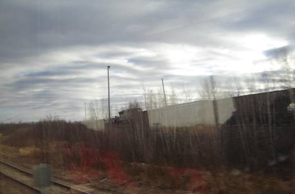 A few minutes after we left Moncton, I heard the familiar sound of the Renaissance car’s suspension mechanisms that sounded like someone being choked to death! At some point, we passed a rail yard where I saw two SD70ACE’s on flat cars. The units looked like they were going to be exported somewhere. I was barely able to get a photo of one of the units.