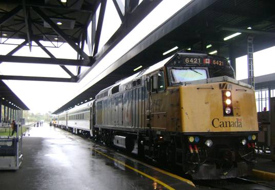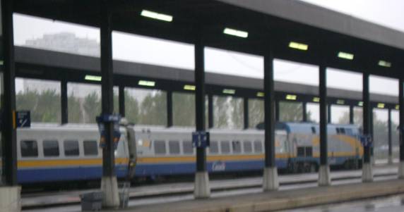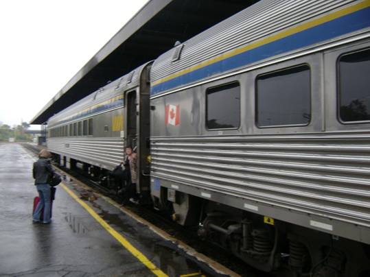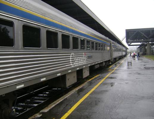 I then walked back to Central station. I saw that train 33 was boarding. However, train 33 has assigned seating so I didn’t have to worry about not getting a good window seat. I was expecting LRC coaches, but when I got to platform level, I saw the train had Hep2 coaches! I was seated in the last car on the train. I had a window seat on the left hand side of the train. From my window, I photographed an AMT commuter train made up of AMT and New Jersey Transit equipment.