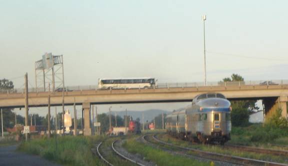 I knew I had to find a store that sold memory sticks ASAP. (There’s never a Wal-Mart around when you need it!) After two false attempts, I got lucky on my third. After I bought the memory stick, I saw an AMT train deadheading back to Montreal, but didn’t film it. I then sprinted to find a good vantage point to film the Ocean. I knew there was a railway crossing about a mile east of the station. With my new memory stick loaded, I got to the crossing in time to film VIA train 26 passing on its way to Quebec City.