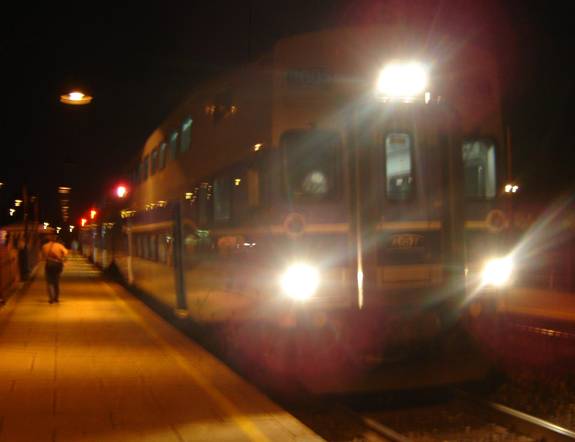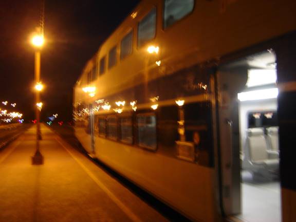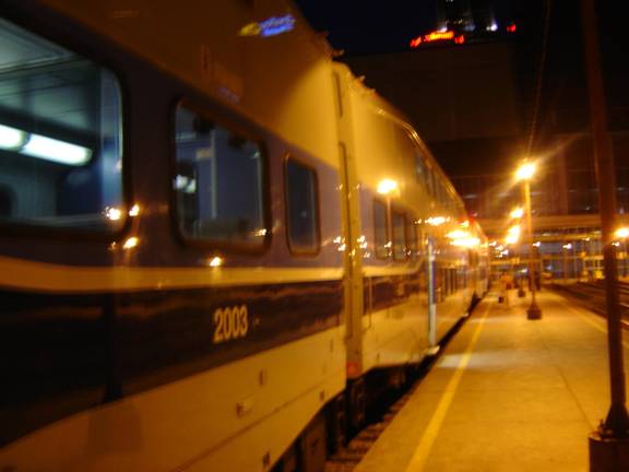 The HEP in the train was shut off leaving us in the dark. The train soon started moving, but stopped. After several minutes, we were off. As we pulled out, I caught a glimpse of the Chaleur led by F40PH #6425.