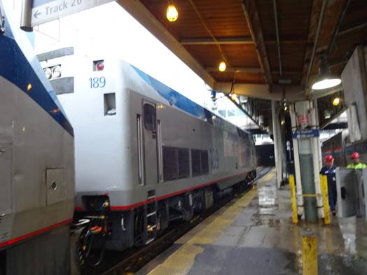 I also photographed P42s #189 and #120 which were on the track next to us. I figured they would be the diesels that would lead the train south of Washington. I would turn out to be right. #189 had an ad promoting the Heartland Flyer in Oklahoma. That unit was obviously far from Oklahoma.