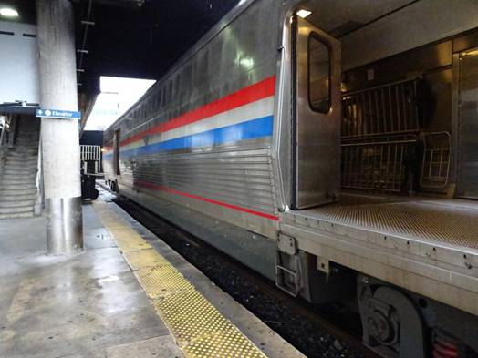 The Crescent began boarding at 2:00 pm. I saw there was a Heritage diner, but I didn't believe I would have time for a sit down dinner in the diner before I got off in Manassas. I was seated in Amfleet 2 coach #25013. I got a window seat on the left hand side of the train. The train left on time.