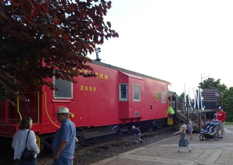 I then filmed the train departing. In the distance, I could see #611 and its train. I photographed a caboose and two freight cars across the street from the station.