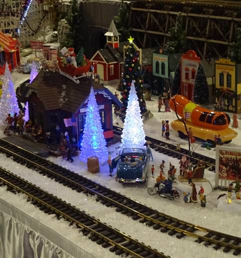 There was an O-sale model of the Polar Express running around a tree. At one point, the train was derailed. Other visitors and I tried to fix it. I eventually did get it rerailed properly. I explained that I knew what I was doing as I had a model railway.