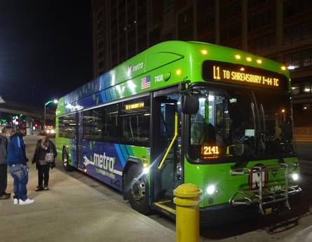 I then made my way to the LRT and rode one stop to Civic Center and got off. I then waited for a bus to take me to my hotel. I saw that route #74 was coming first. While waiting I photographed an electric Gillig bus.