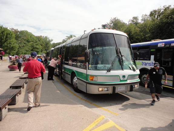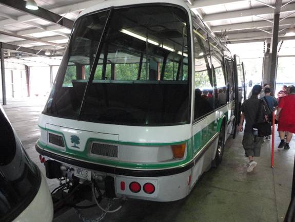 Our first photo stop was the Niagara Parks Commission garage which operates the People Mover which uses Orion 4 buses. People Mover was the biggest customer for the Orion 4. They operate with a bus and a trailer bus! This is quite a unique operation. I took some photos before we got on an Orion 4 with a trailer.