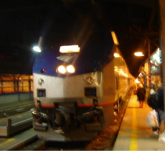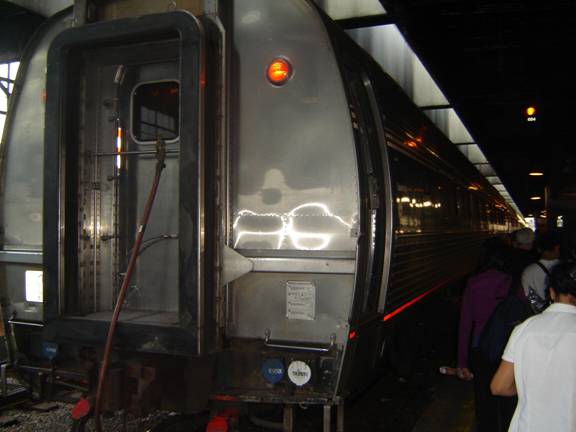 Mark, Jason, and I were seated in a semi-refurbished Amfleet 2 coach. This coach had blue seats, but it had the old reader boards, no AC outlets, red curtains, and beige walls. We departed running 1 hour and 25 minutes late. As we passed train 94, I filmed it. Once my ticket had been taken, I went to the café car for dinner. After I purchased my dinner, I took it back to my seat. On the way, I saw that there was a big line for the café car that the line actually extended to the coach behind the café car!