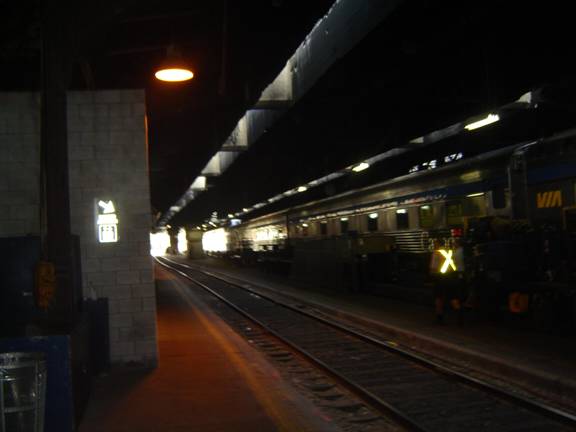 We soon lined up for train 97 and shortly after that, boarding commenced. When we got to track level, I took a photo of the rear of the train and VIA’s transcontinental Canadian which was scheduled to depart 30 minutes after train 97.