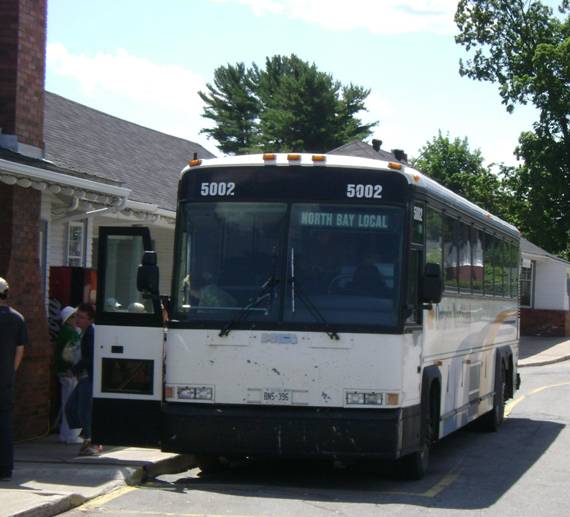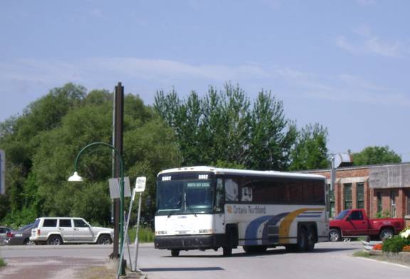 The bus was again pretty full and I had another aisle seat. We soon departed. As we passed the Weber’s location I filmed it and the former TTC Info-bus again. We stopped at Washago. As we passed through Washago, I noted it looked pretty much the same as it did in October of 2005 when I visited. I also saw CN Dash 9 #2590 on a siding all alone. After we left, we stopped at a gas station north of Washago to let someone off. We soon arrived into Gravenhurst. I got off and took a photo of the bus.