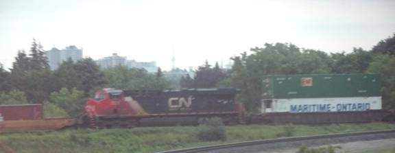 I boarded the cab car and we soon departed. A CN freight train passed just as we departed. However, we had to stop short of the York subdivision because a westbound CN intermodel train was crossing in front of us. I photographed the train's mid train locomotive.