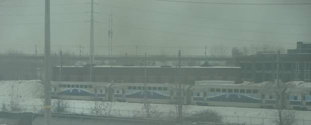 I had a window seat on the right-hand side of the train. The train left on time. Shortly after we left, I saw the Fleur-De-Leys mall. At one point, I photographed a train trestle.