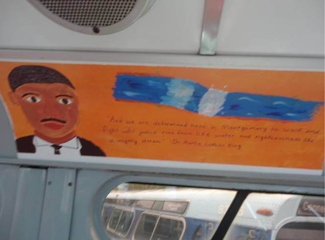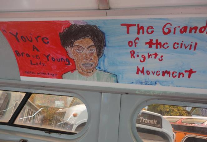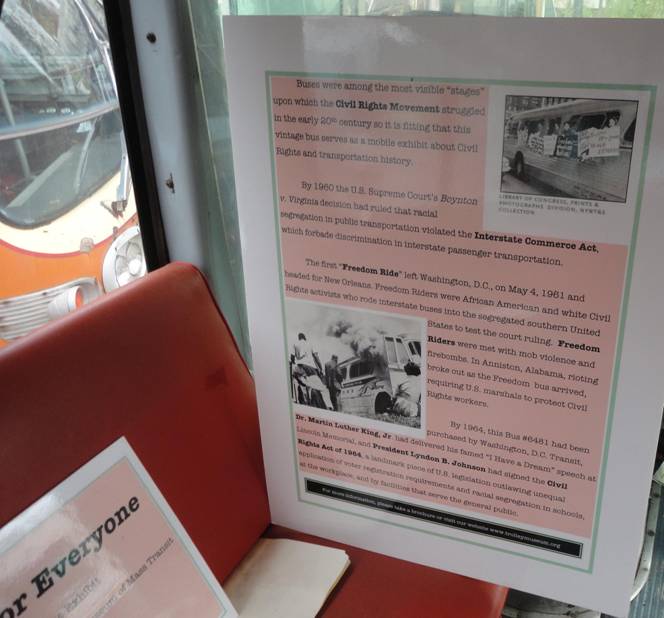 I then took some photos of former Washington DC fishbowl #6481. The interior of #6481 was made into an exhibit about the Civil Rights movement and told the story of a 15 year old black girl who was arrested for refusing to give up her seat for a white person nine months before Rosa Parks was arrested. When she was arrested, she was screaming, “I have rights!” Rosa Parks was not the first person to have broken that transit bylaw. I took some pictures of #6481.
