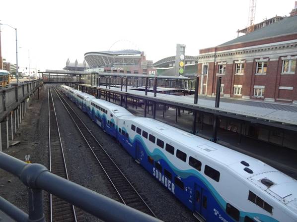 I filmed the bus pulling away. I then headed towards the Amtrak station. I walked through a former station that no longer was served by trains before I got to the Amtrak station. I photographed a Sounder commuter train.