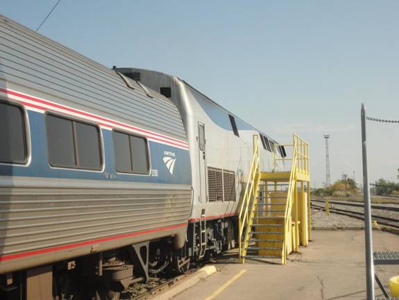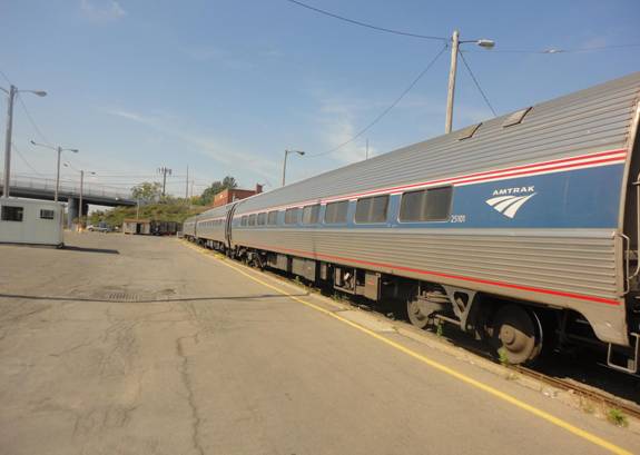 The train departed Niagara Falls, Ontario and crossed into the U.S. We went past the Niagara Falls, New York station and then backed in. We were made to go through customs. The woman who processed me remembered me, but wondered if she had denied me entry before. I told her that she had let me into the U.S. The inspection was fine and I was soon finished. I got back on the train and handed the form to a customs agent. The inspection was soon 100% complete and we were allowed onto the platform I photographed the train which was led by P42 #131.