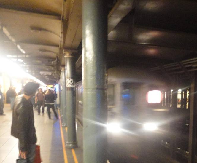 I looked in the gift shop but didn't buy anything. I got my backpack and caught an “E” line train to Penn Station where I bought lunch. I boarded a “1” line train and rode 2 stations north and withdrew money from an ATM. I then went to the M&Ms store and bought some candy. I then made my way back to the subway. I photographed the next “1” train that came in.
