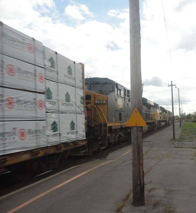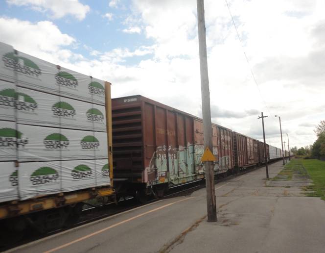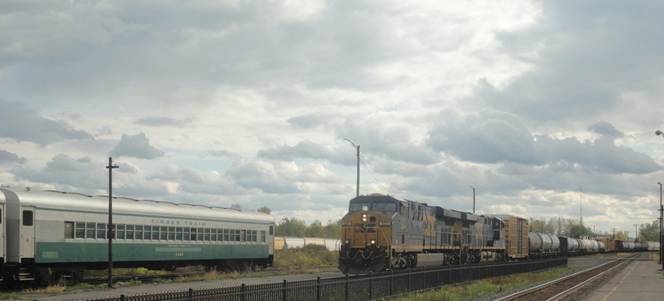 The first train I saw was an eastbound CSX freight with two Union Pacific locomotives leading a CSX unit.