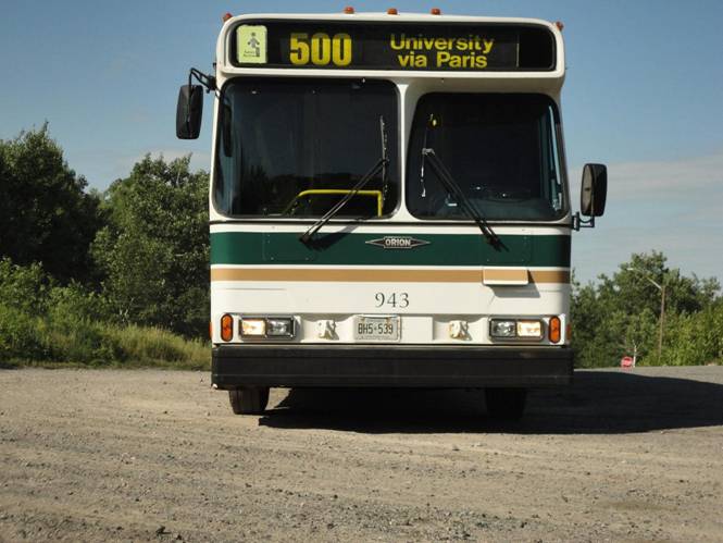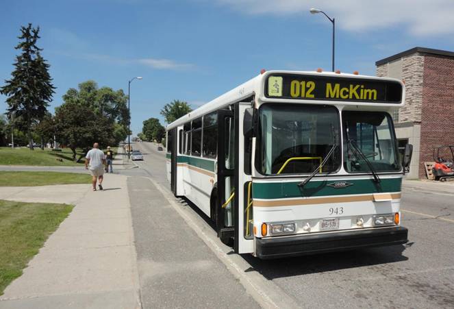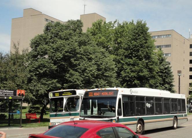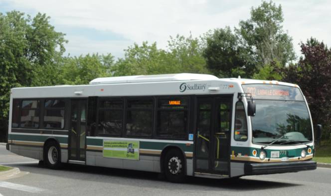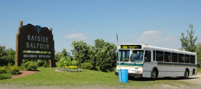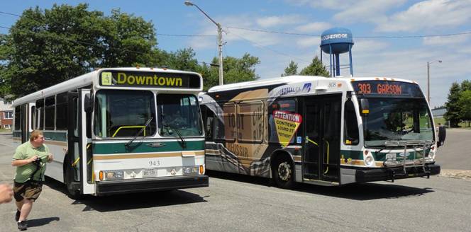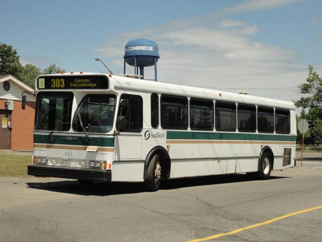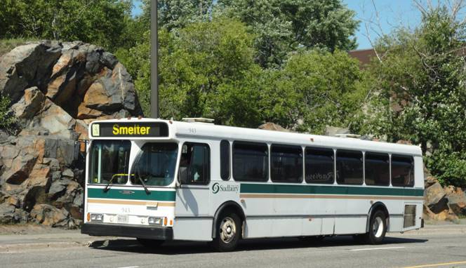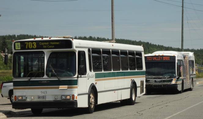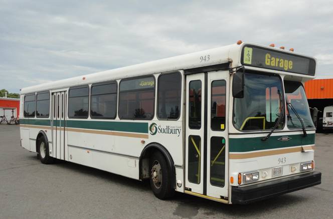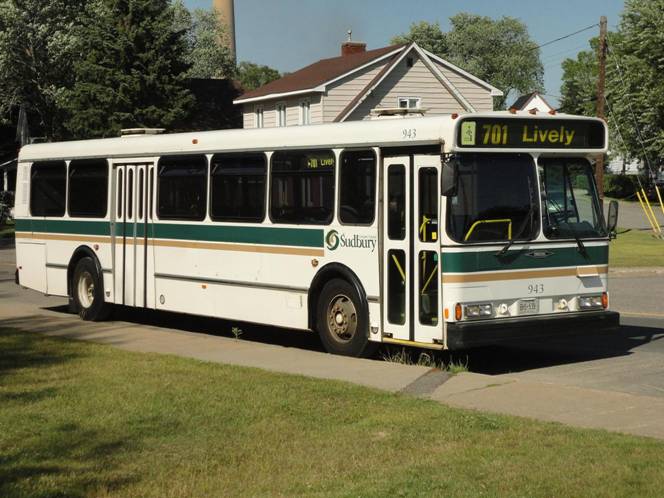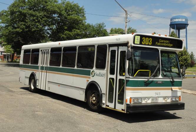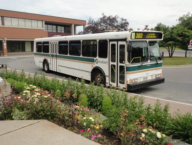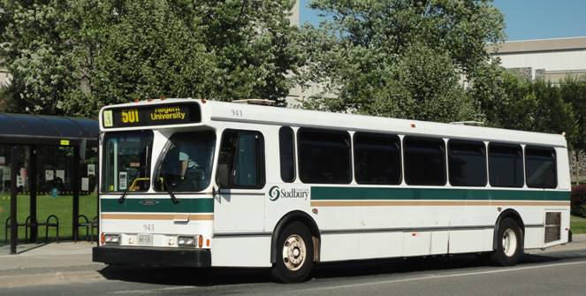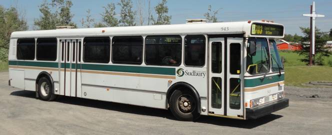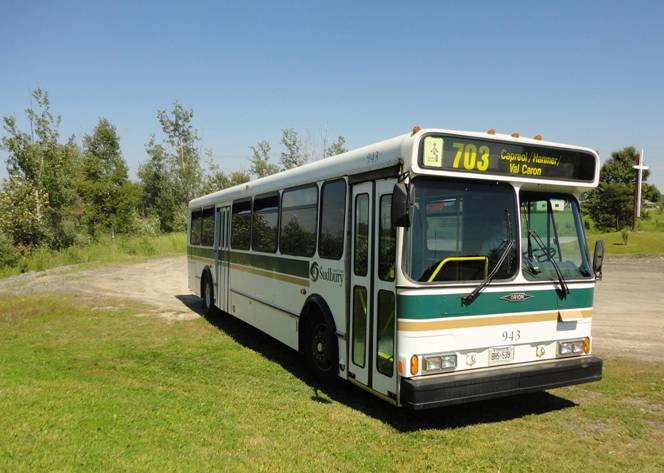 We then headed into Capreol. We posed 943 at the stop where I had boarded a bus into Sudbury the day before. We took some photos of 943 and an in service bus.