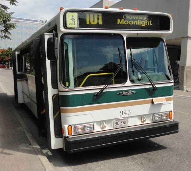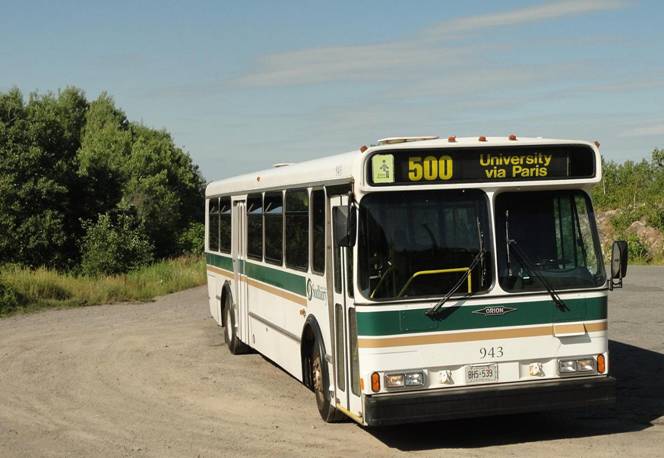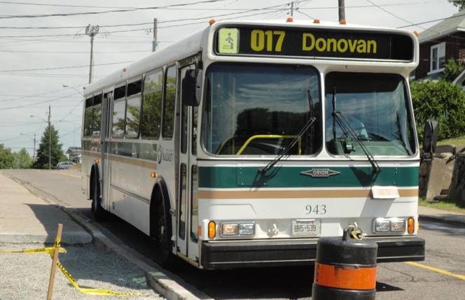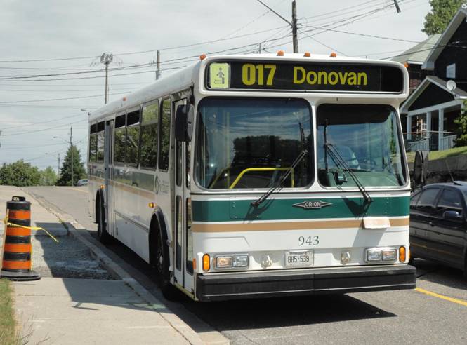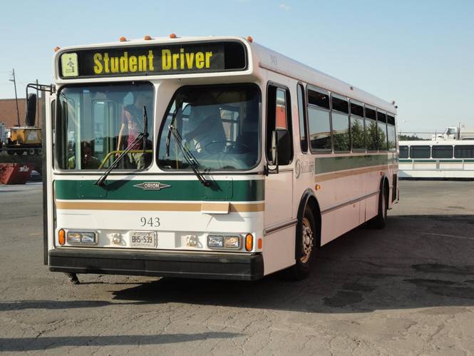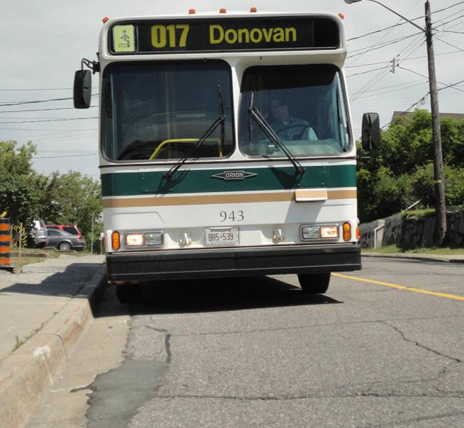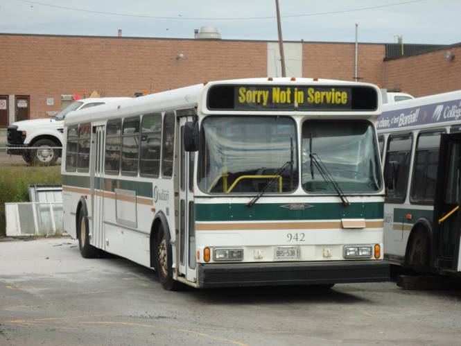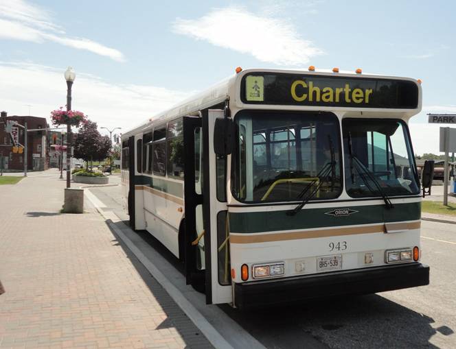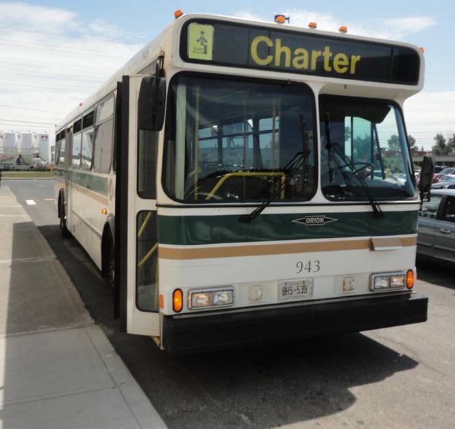 I then saw my bus which was a Nova LFS. I got on and we soon left. The bus took a roundabout route and at one point, the driver had a layover at a mall. After a few minutes the driver got back on the bus. We soon left. A couple minutes later, I got off at my stop. Moments after my bus left, I saw two people I know from the TTS stop in their car. They gave me a ride to the garage. I had been hoping to get a ride to North Bay. I also saw Orion 5 #943 which would be our charter bus. I photographed it.