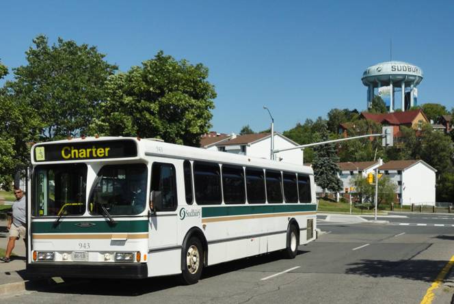 We got back on the bus and left. We headed east and drove on an overpass just north of VIA's Sudbury Junction train station. Our next photo stop was in Falconbridge. We posed the bus near a water tower and photographed it and a service bus.