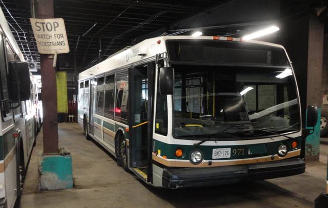 At one point, I saw them start up one of the other Orion 5s, but they apparently weren't much better. We began to wonder if we would have to take some other model bus instead of an Orion 5 which would have been a disappointment. However, our driver, Dave skilfully reversed 943 into a maintenance bay. A little while later, it emerged. The verdict: 943 was fixed so it could go out on the charter after all. We boarded the bus and headed out an hour later then we planned.