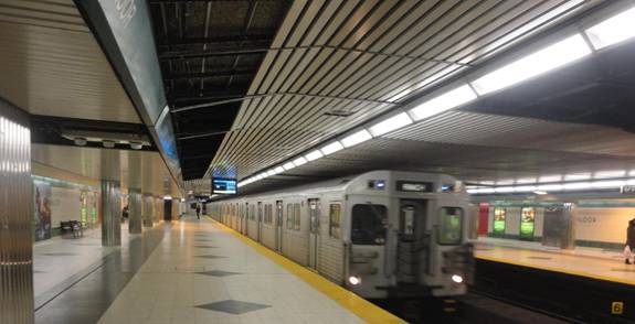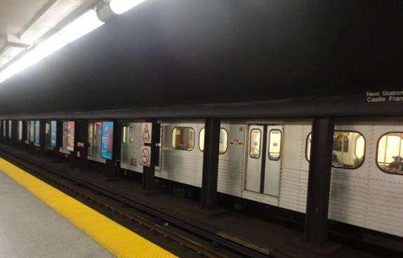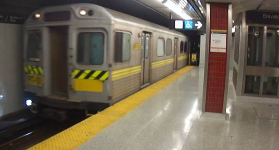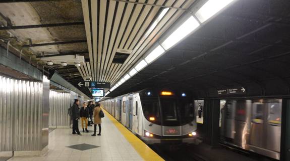 We then filmed the train pulling out. We then went upstairs. Larry was taking photos around the station. I suggested we go to the northbound platform and catch a Toronto Rocket signed up “Eglinton”. Larry agreed and we went to the northbound platform.