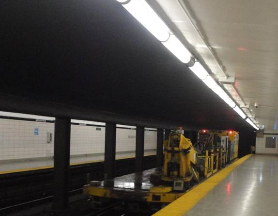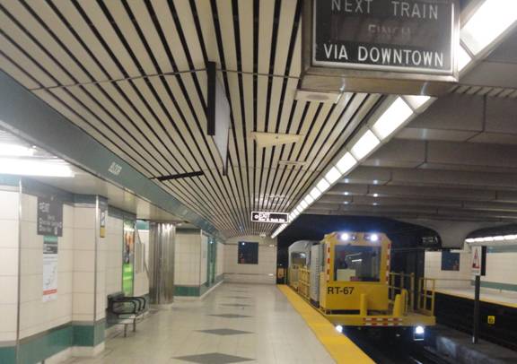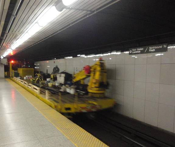 We had planned to meet after 10:30 pm and go to Eglinton station. Since 2007, the TTC has been closing the section of the subway between Eglinton and Finch early for tunnel repair. We would see former Hawker passenger cars converted to work cars going through Eglinton.