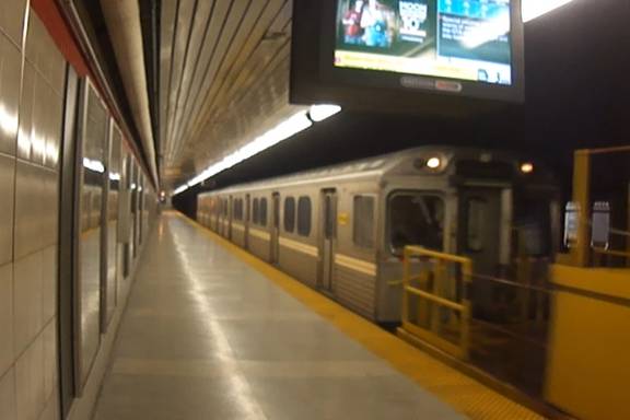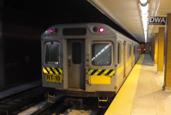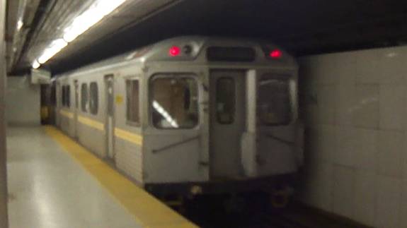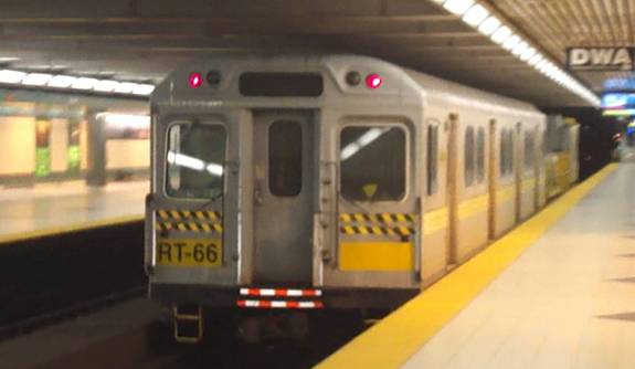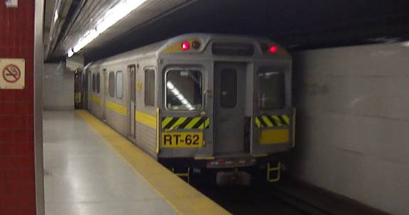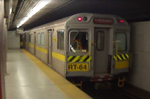 Larry and I decided to go for a ride. We rode two stops north to Summerhill. We got off and filmed the train pulling out. We then went to catch a train back south when we saw lights from another work train approaching going north. We sprinted back to the northbound platform in time to see RT-43 and RT-44 pushing another work car. RT-43 and RT-44 are two of the few remaining H-1 work cars! We filmed them passing through the station. The driver of the work train looked surprised to see us filming.