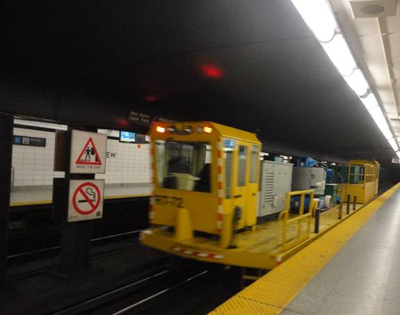 My next interesting experience to get photos occurred over a year later. I again met up with Larry. This time, we were going to photograph work cars on the TTC subway network. The work cars come out after midnight so we stayed up late.