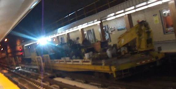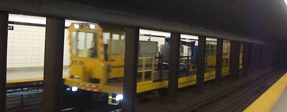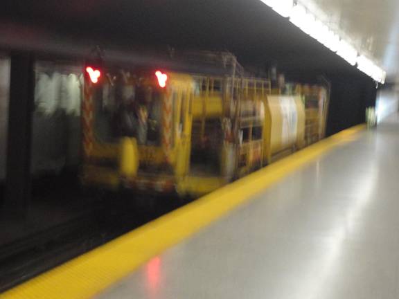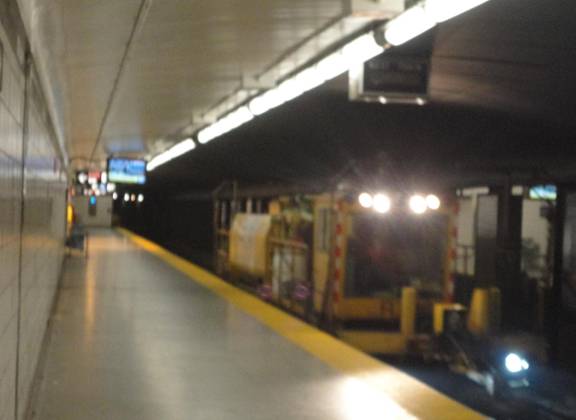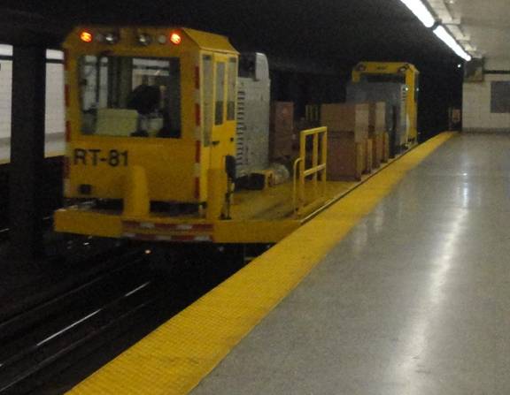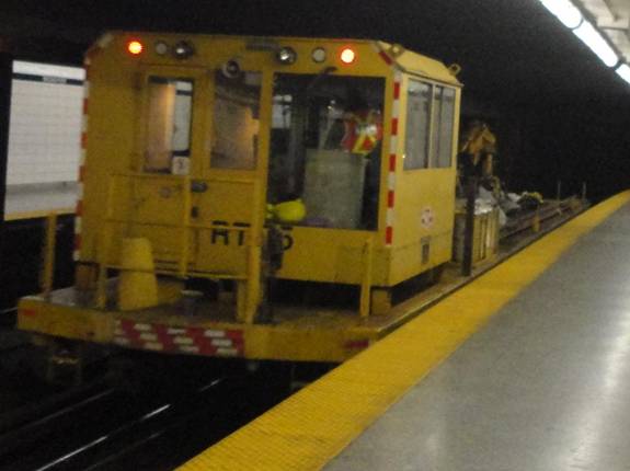 RT-76 slowed at the east end of the station but didn’t stop. The next work car that passed through was the tunnel washing train. From the late 1980s to 2001, the tunnel washer used to be hauled around by some Gloucester work cars until the washer unit was motorized and no longer needed the Gloucesters. I photographed it as it came through.