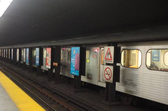 A few minutes later, the next Toronto Rocket train pulled into the station. I noticed two things. First, the train was signed up for Eglinton. Second was that it was the 5651-5656 set which is wrapped for the Bahamas. There are two wrapped Toronto Rocket trains which have been wrapped. The other set is the 5411-5416 set which is wrapped for the new Hobbit movie. Gateway Newsstands is running a contest for people to Tweet a picture of the Hobbit train. (Now if the fact there’s a contest that encourages people to take photos doesn’t convince TTC that photography is allowed on the system, I don’t know what would!)