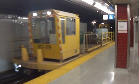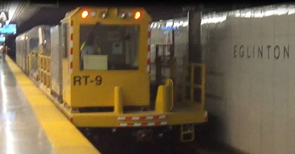 Several minutes after we arrived at Eglinton, the train we were on departed. A few minutes later a train pulled into what is normally the southbound platform. Minutes later, we saw blue lights on the tunnel wall which indicated a work car was coming. It was RT-62 and RT-63; an H-4 work car which Larry and I had photographed the last time we went work car fanning. I filmed it anyway.