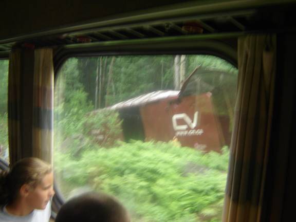 Up until North Bay, we had been running on CN tracks. Upon leaving North Bay, we were now on ONR tracks. We stopped at Temagami. By now, several little kids were on board. One was going to Timmins with his grandmother. At one point, the train passed by about six boxcars that were derailed and scattered beside the line! Some were even on their sides! I took a picture and a video of that site!