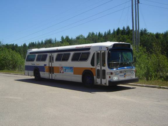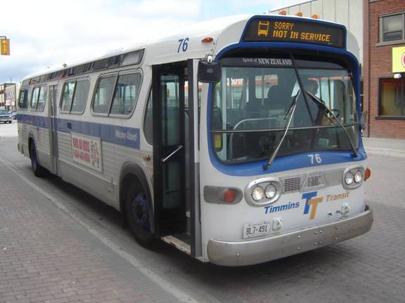 I got up at 9:00 am and had breakfast in the hotel restaurant. After breakfast, I called a number I was given by a Timmins Transit employee and arranged to have a garage tour in the early afternoon. I packed my camera and several batteries and caught a bus, a newer Orion 6. Upon getting downtown, I soon found the first fishbowl, #76. That bus was bought from Victoria, British Columbia with three others. After waiting around the Timmins Transit terminal, I got on route 32.