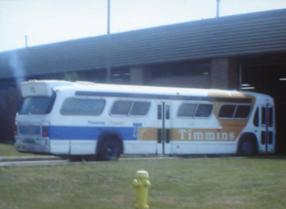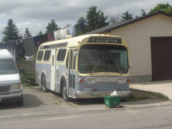 Timmins Transit Route 32 goes past the bus garage, but on the way, I caught a glimpse of a 30 foot fishbowl in a driveway, so I got off the bus and went to check it out. The bus was ex Stratford Transit #7323 which had been converted to a camper. That bus’s sister #7322 is privately owned in Toronto and is operational.