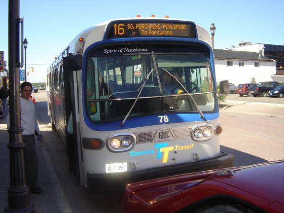 After the tour, Percy gave me a ride back downtown where I stopped at a Wendy’s for lunch. After lunch, I took a long ride on fishbowl #78, another ex Victoria fishbowl to South Porcupine and back. I hoped that I wouldn’t run into that kid I saw the day before on the Northlander and the connecting bus. Fortunately, I didn’t see him again. When I got back downtown, I took a picture of bus 78. The driver covered her face when I took the photo.