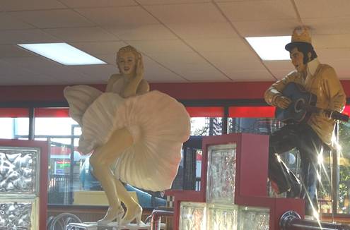 We left and returned to the hotel. We stopped for dinner at the Burger King near our hotel. This Burger King had some statues of Marilyn Monroe and Elvis; the later was wearing a paper Burger King crown. I photographed the statues.