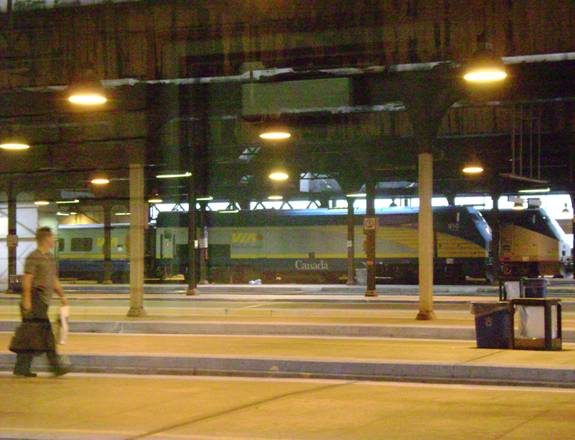 I got to Toronto Union station pretty early; one hour before train 97 would depart. I saw that VIA train 71 would depart for Windsor at 7:50 so I decided to go film it departing. On the way to my favorite vantage point west of Union station, I peeked in through a door and photographed the engines on trains 71 and 97.