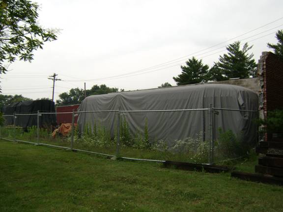 Inside the remains of the carbarn were two streetcars under tarps. One looked like a PCC and I am guessing it is former Washington PCC #1430. They were moved in after the fire.