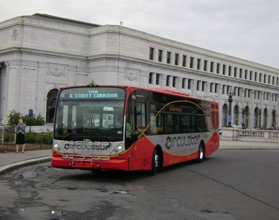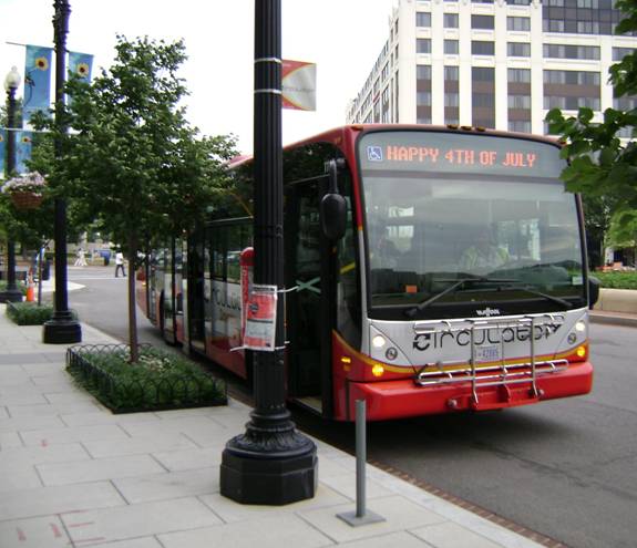 The buses used by the Circulator were originally destined for AC Transit in California, but the company couldn’t afford all the buses, so Washington picked them up. The buses are numbered in the 1100 series. There is a bus numbered 1122, but I didn’t see it. While waiting, I took a few photos, including a photo of a 35 foot Orion 7.